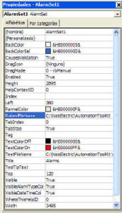 Una vez que ha pegado el componente sobre un formulario, en la ventana de propiedades seleccione «Personalizado» para poder crear la lista de eventos que desea utilizar en su sistema de automatización como se muestra en la siguiente figura: (el archivo de definiciones de alarmas se guardará con el nombre y en la ruta especificadas en la propiedad «TextFileName»)
