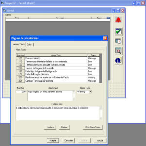 Desde aquí podrá crear Eventos de alarmas que serán disparados por su aplicación mediante el método «RaiseAlarm», estos eventos se guardarán en el archivo especificado en la propiedad «RaisedFileName».